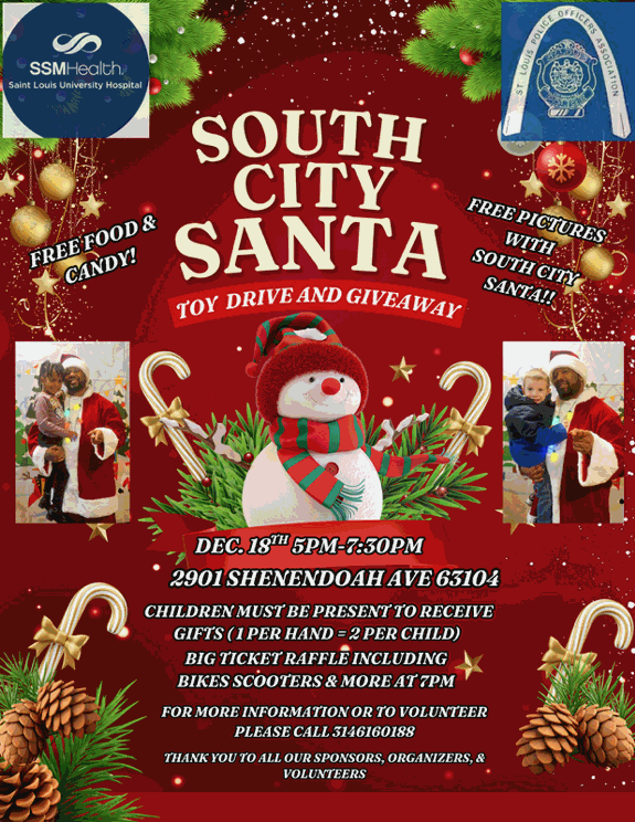The South City Santa event scheduled for this Thursday, December 18, 2025, from 5pm to 7:30pm, has been moved to 2901 Shenendoah Ave. Inclement weather is expected so this move will provide an opportunity for the participants and workers to be inside. We hope you will consider joining us. Read More...